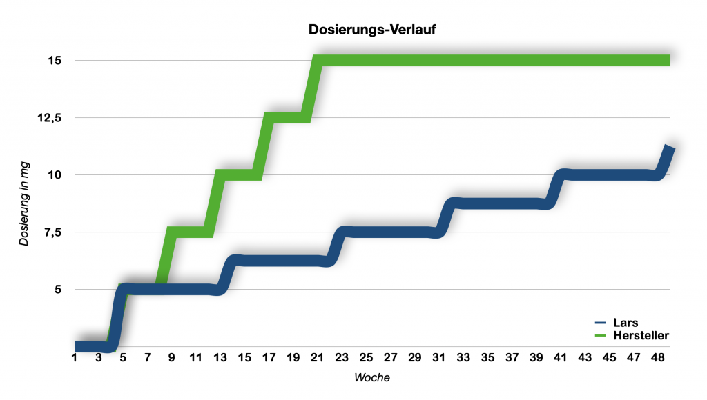 Die Grafik zeigt auch, dass man lt. Hersteller nach einem halben Jahr schon auf der Höchstdosis von 15 mg sein sollte – da war ich gerade mal bei der Hälfte (7,5 mg). Dass ich die Dosis deutlich langsamer gesteigert habe, hat in meinen Augen 3 Vorteile: