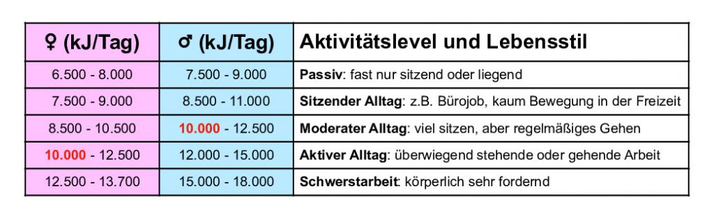 Um weiter rechnen zu können nehmen wir mal einen mittleren Verbrauch von 10.000 kJ pro Tag an. Um unsere Rechnung dann noch etwas zu vereinfachen, gehen wir von einer absoluten Null-Diät aus. Wir nehmen also keine Energie (Nahrung) zu uns.