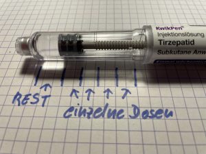 - man fängt immer mit 2,5 mg an, um den Körper an den Wirkstoff (Tirzepatid) zu gewöhnen und steigert die Konzentration dann langsam und nach Bedarf