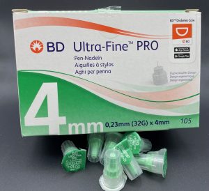So habe ich zum Beispiel mit Billig-Injektionsnadeln von Amazon schlechte Erfahrungen gemacht. Da bekommt man einen 100er-Pack für ca. 20 Euro oder noch günstiger. Allerdings greift das Gewinde nicht richtig (man schraubt die vorne auf den Pen), die sehr feinen Nadeln verbiegen extrem leicht usw. Daher nutze ich nur noch die BD Ultra-Fine PRO Pen-Nadeln (0,23mm (32G) x 4mm) – siehe Foto. Die habe ich in Deutschland in der Apotheke gekauft und knapp 40 Euro für 105 Stück (ja, seltsame Packungsgröße) bezahlt. Das sind knapp 40 Cent pro Woche und bei dem was der Pen kostet, spielt das nun wirklich keine Rolle mehr.