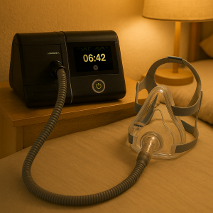 CPAP-Gerät mit Maske (Symbolbild). Der Schlauch ist Wirklichkeit natürlich länger 😉