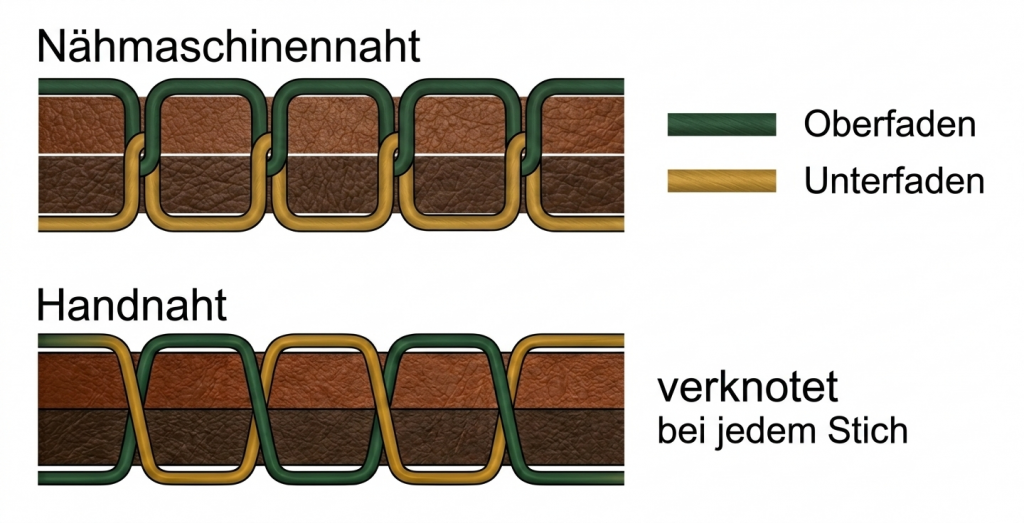 Schematische Darstellung Maschinennaht vs. Sattlerstich (Handnaht)