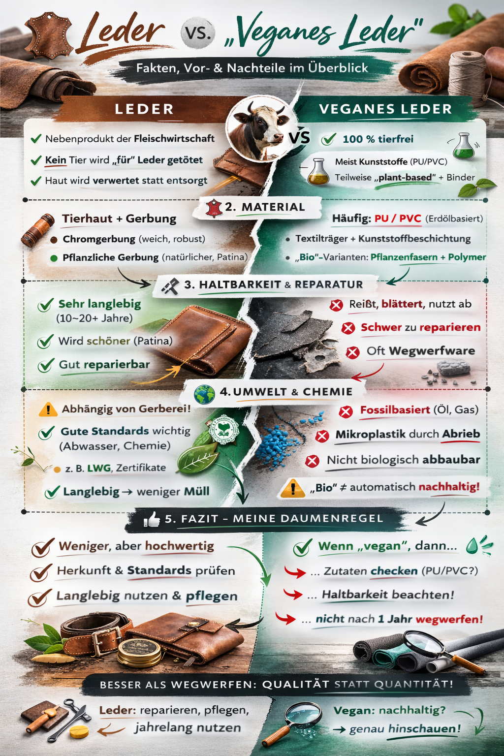 Aber: Leder ist nicht automatisch „gut“. Entscheidend sind Herkunft, Haltungs-/Schlachtbedingungen (als Teil des Systems) und vor allem die Produktion in der Gerberei. „Veganes Leder“ ist häufig Kunststoff oder Hybrid: tierfrei ja – aber nicht automatisch langlebig oder ökologisch überlegen.