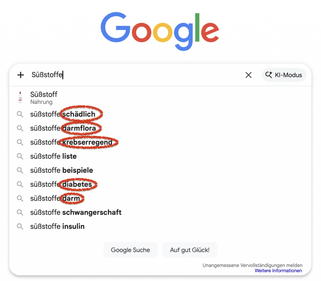 Wie groß die allgemeine Verunsicherung ist, zeigen vielleicht auch die ersten Suchvorschläge die man bekommt, wenn man bei Google den Begriff „Süßstoffe“ eingibt: